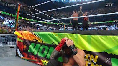 Priest se dispone a usar la silla, pero Bunny lo golpea con un golpe bajo. El cantante vuelve a coger la silla, momento en que Finn Bálor y Dominik Mysterio irrumpen en escena para atacar al face. Bálor coloca la silla metálica en uno de los esquineros. Rey Mysterio acude rápidamente para salvar a Bunny, pero se encuentra en inferioridad numérica. ¡Carlito aparece para salvar a los faces!